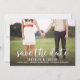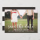 Whimsical and stylish save the date announcement with photo featuring white modern calligraphy script and striped patterned back