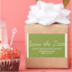 Whimsy Save the Date Stickers in olive green and white with a simple and fun script typography design. These trendy save the date stickers are easy to customise with your wedding details. For more customisation options, click on the Customise It button.