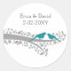 a grey whimsy love tree branch with two blue love birds on tree branch, mod and trendy wedding favour stickers. Matching products also available.