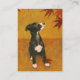 A cute and winsome black and white Whippet Puppy sits attentively on a gold-toned background, gazing up at red leaves above. The rich colors give a sense of autumn and playfulness.