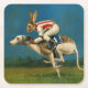 This coaster is illustrated with a rabbit jocky riding a racing whippet.