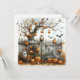 In the hush of twilight, where the veil between worlds thins, a crooked tree looms like a forgotten sentinel over a fence tangled in cobwebs and secrets. Jack-o'-lanterns leer and grin—some dangling like cursed fruit, others nestled in fallen leaves, their flickering eyes casting mischief and warning. Bats slice through the dusk, an owl watches with ancient knowing, and a ghost cradled in a wicker basket waits silently, as if summoned by memory. Every element breathes with eerie anticipation, as if the night itself is holding its breath for what comes next.