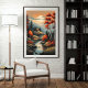 Immerse yourself in the tranquil beauty of this autumn forest scene, where a gentle stream winds through a vibrant landscape of fiery red and orange foliage. Towering trees and rolling hills frame the soft glow of the setting sun, creating a peaceful and cosy atmosphere. Perfect for adding warmth and seasonal charm to your home, this painting captures the serene essence of fall.