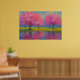 A symphony of spring unfolds in this impressionistic landscape, where blooming cherry blossoms shimmer in hues of pink, crimson, and violet. Their delicate forms stretch skyward, mirrored in the still waters below, creating a dreamlike duality. The golden sky—caught between sunrise and memory—casts a gentle glow across the meadow, where red and yellow wildflowers whisper in the breeze. Birds drift silently overhead, adding motion to the stillness, presence to the peace. This piece invites quiet reflection, evoking the fleeting beauty of light, nature, and time suspended.