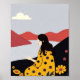 The background is minimalist yet enchanting, with soft pastel colours and a single cloud floating gently above. The flowers scattered around her—daisies and other blossoms—symbolise renewal and joy, making this artwork perfect for those who appreciate nature-inspired designs and whimsical art styles.