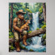 This captivating artwork captures a moment of trust between Bigfoot, wearing a cowboy hat, and a small deer fawn nestled close to him near a picturesque waterfall. The lush forest provides a vibrant backdrop. The thick, textured strokes bring the scene to life, emphasizing the unspoken bond between the two unlikely figures in the heart of the wilderness.