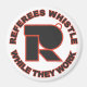 Referees really do whistle while they work. Referee's letter R logo with whistle shape. Customise with a name and/or number or a different coloured background, if you like, by clicking on "Customise this design".