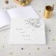 This elegant quiet luxury wedding guest book features white sculptured roses on a white background, bride and groom name in an elegant modern font and handwritten script.