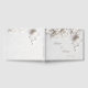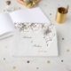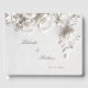 This elegant quiet luxury wedding guest book features white sculptured roses on a white background, bride and groom name in an elegant modern font and handwritten script.