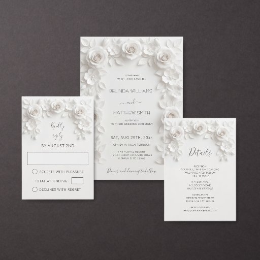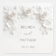 This elegant quiet luxury wedding sticker features white sculptured roses on a white background, bride and groom name in an elegant modern font and handwritten script.