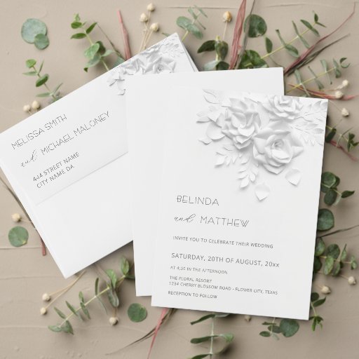 Experience contemporary elegance with our minimalist 3D paper cut white roses wedding napkin. This design features a sophisticated curved silhouette paired with textured white roses art and clean, architectural typography. The left-aligned layout offers a fresh, modern aesthetic for couples seeking a unique and professional look for their special day.