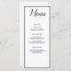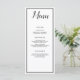 A white and black classic menu, this wedding reception menu features a lovely white background with a black font. Featuring "Menu" written at the top using cursive black font, all of your information is printed in black readable font on a white background. Customise as you choose.