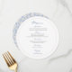 Chic, fresh and playful. This circular menu card template features a set of trendy and modern fonts, against a crisp white background. It includes 4 meal and drink sections. The back of the card wears a playful floral blue jacket. Cheeky and fun. Personalise to make it your own.