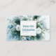 Define your brand with pristine clarity and serene elegance using this captivating business card. The design features a lush, spherical arrangement of cool-toned botanicals set against a bright, airy background. The arrangement is dominated by soft white and dusty blue flowers, intricate filler blossoms, and striking long, frosted evergreen needles, creating a stunning winter motif. The overall effect is ethereal, with soft shadowing and delicate textures. Your information is framed by a clean white square with a thin metallic gold line, providing a crisp, elegant focus for your essential information. This artwork beautifully captures the quiet, refined elegance of a hidden winter garden, resulting in a unique and sophisticated brand statement. This business card is ideally suited for a high-end event stylist specializing in winter or seasonal themes, a luxury jewelry designer showcasing cool-toned or icy pieces, or a modern florist emphasizing crisp, white and blue arrangements. It would also perfectly suit a boutique candle maker whose products evoke crisp winter scents, or a fine art print seller focused on serene, seasonal scenes.