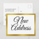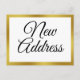 'New Address' appears in black script on the front of this moving announcement. On back you can personalise your card with your change of address with your name, new address, e-mail address and/or cell phone numbers. All text can be edited or deleted.