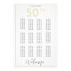 .: White and gold come together beautifully in this retro style 50 for this 50th birthday seating chart!