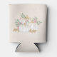 Can cooler with fancy watercolor white pumpkins with accents of faux gold glitter. Surrounded by green leaves and pink wild flowers.