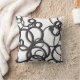 Modern abstract grey and white throw pillow features a geometric pattern of light grey and slate grey circles with black accents on a white background.