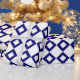 A sophisticated graphic pattern of interlocking white and navy diamond shapes. The dark blue diamonds each contain a small white diamond making white the dominant colour of the original design.