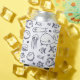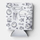 White and navy ink pen drawing of a variety of ocean sea creatures (including fish, whale, jellyfish, and puffer fish), printed on a white and navy can cooler/stubby holder.