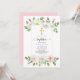 White and pink wild dog rose floral girl baptism invitation. This design showcases garlands of watercolor white and blush pink dog roses with green leaves on the upper and bottom parts and your text in a pink frame. The back is of pink colour.