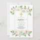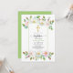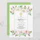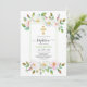 White and pink wild dog roses green floral girl Baptism invitation. This design showcases garlands of watercolor white and blush pink dog roses with green leaves on the upper and bottom parts and your text in a green frame. The back is of green colour.