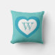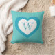 This pillow features a white and turquoise heart with a monogram initial at its centre on one side and a repeating turquoise heart pattern on the other. Click, "Customise" to change background colour and personalise text.