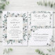 Elegant floral wedding invitations featuring your names encircled by a wreath of white watercolor anemones, ivory roses, and dark sage green leaves with your wedding details displayed below. The white anemone wedding invitations reverse to display a beautiful dark sage green watercolor background.