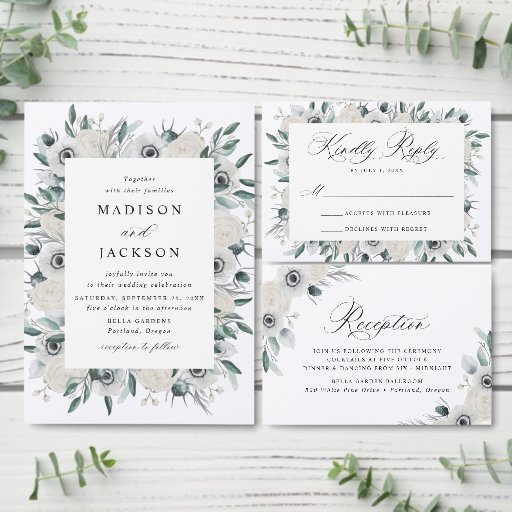 Elegant floral wedding napkins featuring your names encircled by a wreath of white watercolor anemones, ivory roses, and dark sage green leaves. The white anemone wedding napkins are designed to coordinate with our White Anemones and Roses wedding collection.