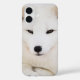 Photo close-up of a cute arctic fox resting in the snow. The animal has white fur and brown eyes, and is looking at you.