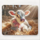 A young calf with a pink bow tied around its neck lays on a bed of straw in a barn stall with sunbeams shining