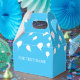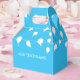 White balloon pattern on pastel blue background. Custom party favour boxes. Edit text to customise. Great for personalised party decor.