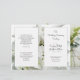 White beach wedding program to fold in half. Black text is easy to customise on both sides, equalling four pages in the program. White panels over a white floral background give the design a two-dimensional appearance. On the front a large white starfish / sea star is tucked among the flower petals. (The background images can also be removed for a plain, black and white program.) Include scripture (love is patient - or your choice) and a message from the couple on the "back". This template accommodates a longer ceremony needing lots of text, but can be used with less text as well. Fold after purchase.