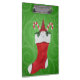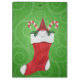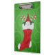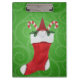 This clipboard is green with fancy swirls with a red and white Christmas stocking that has a gnome with a white beard wearing a pointy dark red hat in the top of the stocking along with two candy canes and holly leaves with berries on the front and back.