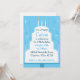 This is an invitation showing a blank white birthday cake on a blue background with balloons