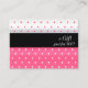 Gift Certificate - Beautiful upscale design featuring a black, white and pink polka dot design. Makes a great gift certificate for beauty salons, spas, cosmetologists, nail salons, dance studios, boutiques, designers, hair and fashion stylists, retail professionals, etc... 100% Customisable. Ready to Fill in the box(es) or Click on the CUSTOMIZE button to add, move, delete, resize or change any of the font or graphics. Made with high resolution vector and/or digital graphics for a professional print. NOTE: (THIS IS A PRINT. All zazzle product designs are "prints" unless otherwise stated under "About This Product" area) The design will be printed EXACTLY like you see it on the screen and on the product...so please make sure when you do your changes on the resizing of any of the graphics or text that it fits in the areas correctly and that your spelling and wording is how you like it to be in size, colour and font. If you have any questions about this design please contact me at siggyscott@comcast.net or visit my store link: http://www.zazzle.com/designsbydonnasiggy?rf=238713599140281212 (Copy and Paste) I'll be happy to help. Thank you for the support and stopping by my store - DesignsbyDonnaSiggy. © Donna Siegrist