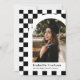 This modern and unique graduation announcement features a white and black chequered background highlighting a photograph of the graduate framed in a white arch with the graduate's name and school beneath. A small gradation cap is cleverly displayed in the checked background with the graduate's graduation year. The back has a fun matching checked pattern in the same white and black.