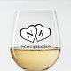 White & Black Heart Monogram Wedding Stemless Wine Glass