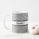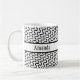 The surface of this mug is covered in a funky, retro white and black pattern with rows of diagonal waves. Through the centre is a black-bordered white band. A first name has been added over this band to both sides of the mug. You can add your name where the placeholders appear, write something else, or remove the words altogether. The font can also be changed to another if you like! It's great to play with this design and make it your own. Personalising and editing is fun!