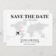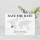 Black and white world map wedding save the date card for a destination wedding. Personalise it with your event information.
