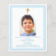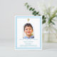 A white background, decorated with a sky blue frame, and a white cross Personalise and add a photo name and details. Blue text. Arch shaped photo frame.