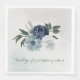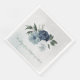 Beautiful botanical wedding paper dinner napkin featuring romantic white, dusty blue and navy blue flowers with green leaves.
