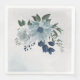 Beautiful botanical wedding paper dinner napkin featuring romantic white, dusty blue and navy blue flowers with green leaves.
