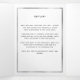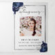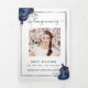 An elegant tri-fold program. A white background, a faux silver frame, dark blue florals and space for a photo. Personalise and add name, dates and your text.