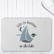 A cute bath mat, perfect for a lake house or those who simply love sailing. With a very light grey background, there is an image of a blue and grey sailing boat and the dark grey typography reads "Life is better on the lake".