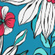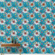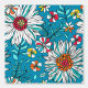 This is a graphic composition consisting of daisy flowers with white and light teal petals and yellow-red and orange-red cores and other garden flowers and light teal leaves on a blue background.