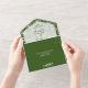 Elegant white botanicals and dots on a green background (or any colour), these tri-fold wedding invitations feature your details in chic lettering in sections and a detachable RSVP card for guests to complete and return. **REMEMBER to put a stamp on the RSVP card and include envelopes on your order to mail invites!