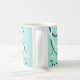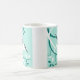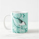 Stylised Nuthatch art on mugs with light blue background and leaf pattern around decorative branch swirls