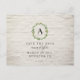 A wedding save the date postcard featuring a green wreath with monogram over a white brick background. Matching wedding invitations and other coordinating items can be found at Jill's Paperie.