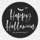 White Brush Lettering Happy Halloween | Thank You Classic Round Sticker. Send Halloween greetings to family and friends with this customisable sticker. It featuring brush lettering with bat illustration. This fun and modern Halloween sticker is perfect for invitations, cards and party gifts and favours. Personalise by adding your own details.